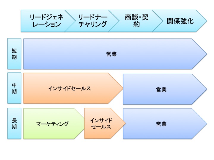 フォローをしていく際には、短期でアプローチできるリードには営業がフォロー担当、中期的なアプローチには最初はインサイドセールスでフォローし、営業へ。長期的な関係が必要な場合はマーケティングから初めてリードナーチャリングの段階でインサイドセールス でフォローするというように大きく分けておくと混乱がなく、素早く適切なフォローが可能です。それぞれでコンタクトをとった後に状況に合わせてステージを変えていく方法が良いかと思います。